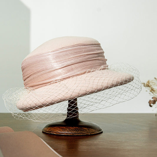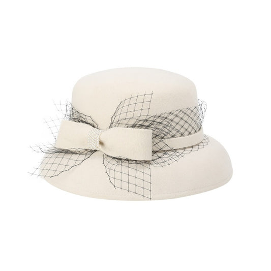 Felt Top Hat Rolled Edge with Net Gauze Pearl Bow