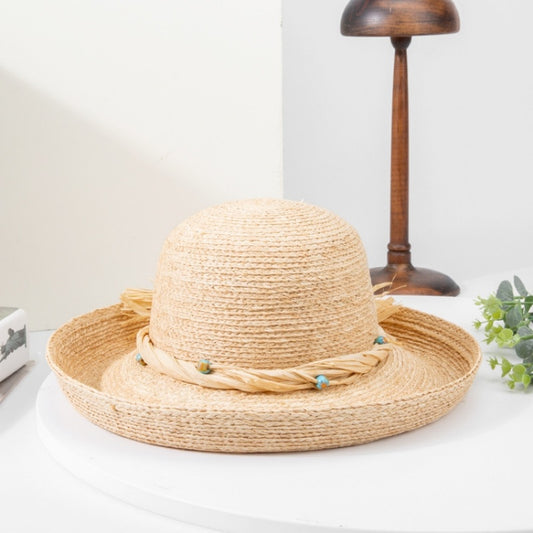 Rolled Edge Sun Hat Straw Hat with String Beads and Bow